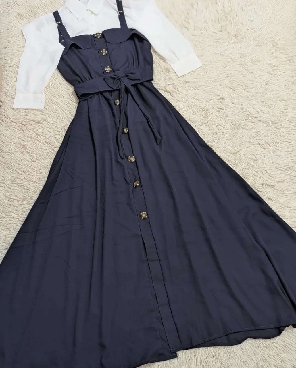 Turn heads with this stylish button-down maxi dress paired with a crisp white shirt for a chic layered look. Perfect for casual outings, office wear, or semi-formal gatherings, this outfit blends comfort with elegance. The flowy design and flattering fit make it a must-have for your wardrobe.