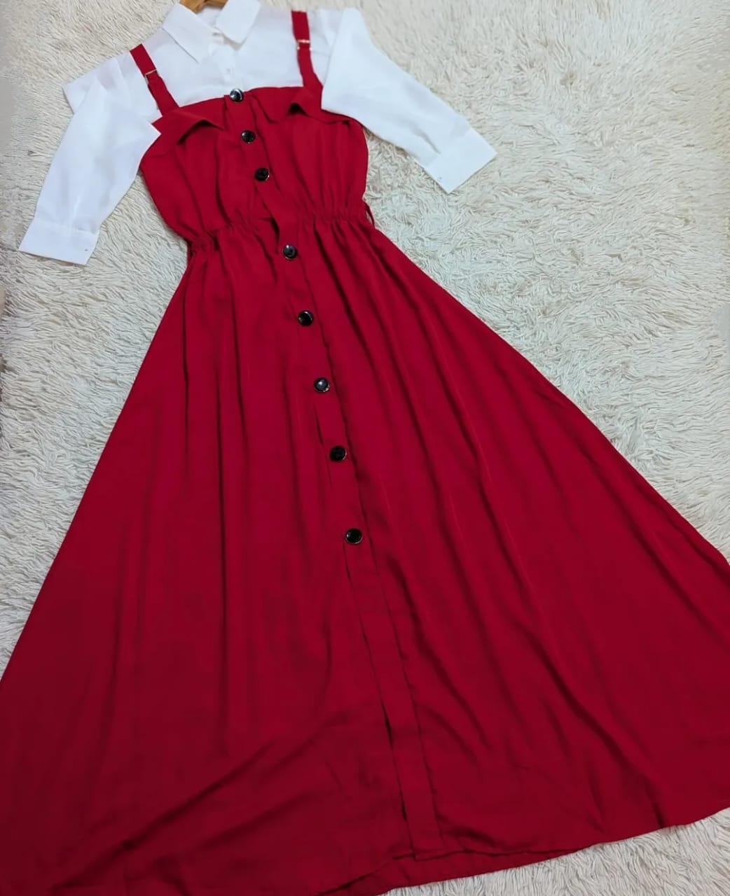๐ 2-in-1 Style: Red sleeveless maxi dress with an attached white shirt look